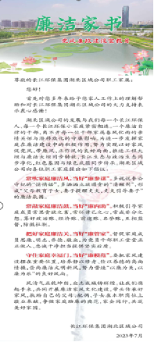 家是最小的国,国是千万家。家风是检验作风过硬的“试金石”,区域公司党总支开展家庭守廉活动,融巧思、寄真情,向全体职工家属发放《党风廉政宣教月廉洁家书》,推送廉洁短信,以“小家”助“大家”,传递家庭助廉;8名家属代表以视频或短信的形式分享心得,以好家风“廉”接好作风,筑牢家庭“廉洁防线”。
