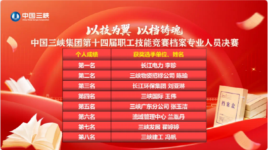 本网讯(吴茜)7月4日,集团公司第十四届职工技能竞赛档案专业人员决赛在湖北武汉圆满落幕,ty8天游平台登录环保集团参赛选手凭借扎实的专业技能和精彩的现场表现,在竞赛中脱颖而出。其中,安徽区域公司刘亚琳获得竞赛个人第三名,并将被授予“中国三峡集团技术能手”“中国三峡集团青年岗位能手”称号;江西区域公司汤玉玉和安徽区域公司刘亚琳所在参赛队伍,在“请听档案说”团体竞赛环节排名第一,获得“最佳展示奖”。