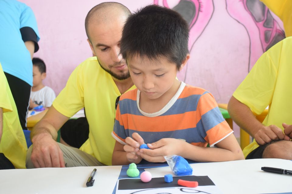 志愿者为孩子们示范彩泥创作方法接着,志愿者拿出了为孩子们准备的色彩鲜艳的橡皮泥及手工用具等,并为小朋友们细心讲解了捏橡皮泥的方法。在志愿者们的帮助下,孩子们开始动手操作。小朋友们充分发挥自己的想象力和动手操作能力,利用搓、揉、捏、团等多种方式,用一双双灵巧的小手,将橡皮泥变成玫瑰花、卡通人物及各式各样的小动物。最后对优秀橡皮泥手工制作者也发放了彩笔作为奖励,活动现场气氛浓烈,充满欢声笑语。