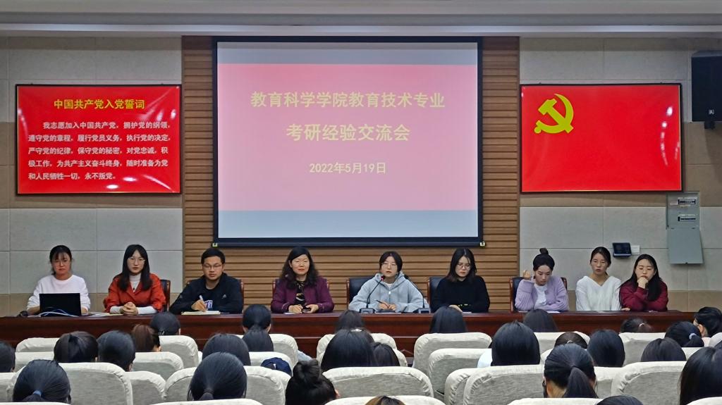 时间:2022-05-19 18:15:17 来源:教科院新闻部 作者: 阅读: 次为营造良好的学习氛围,充分发挥榜样力量,5月19日,教育科学学院教育技术学专业在教科楼301会议室举办“教育技术学专业考研交流分享会”。会议特别邀请到考研上岸的2022届毕业生为2019级、2020级学生传授考研经验。团委老师田园,专业教师刘萱、武滨、宋晔及教育技术专业全体学生参会,会议由刘萱主持。
