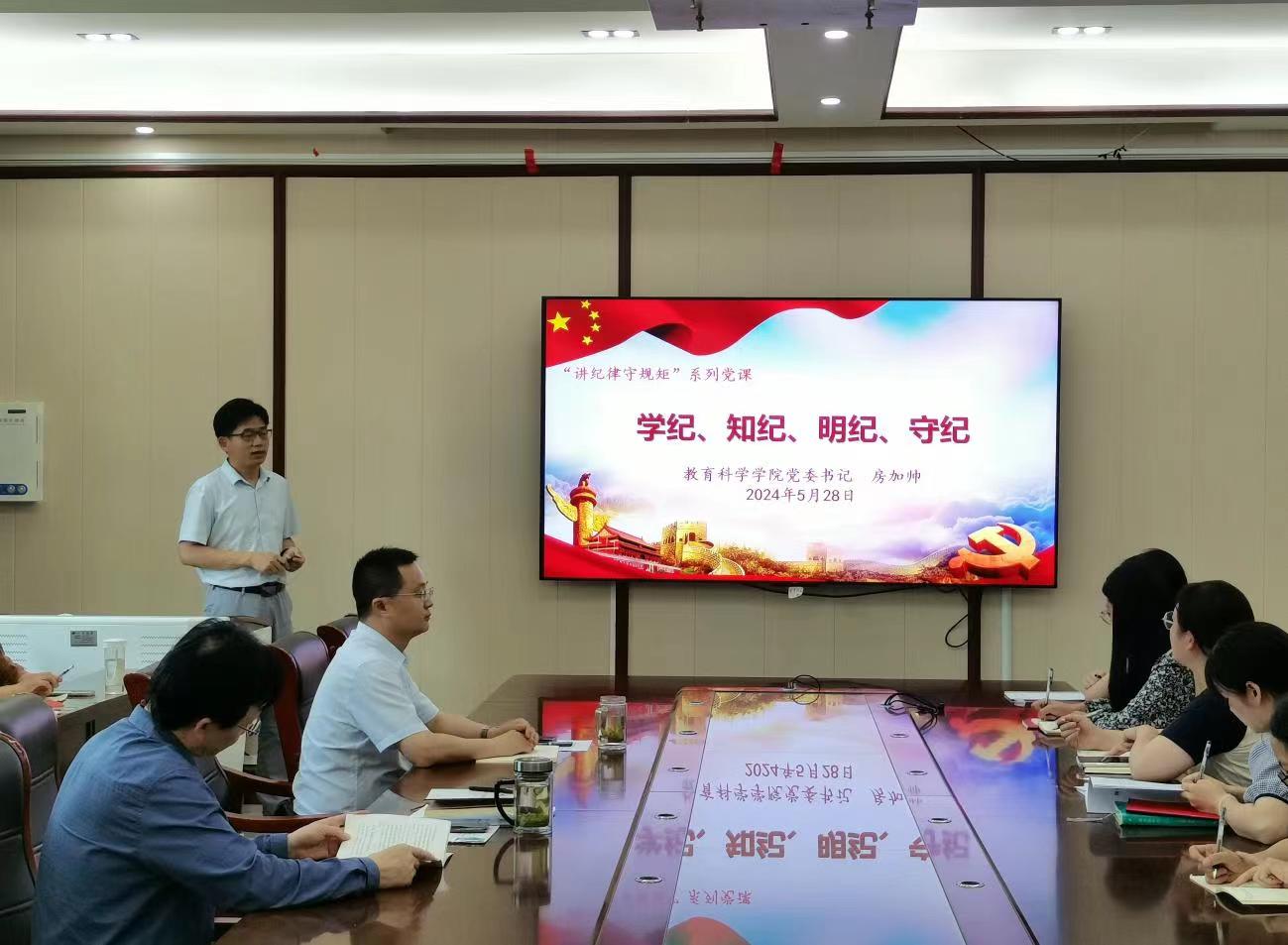 教育科学学院党委书记房加帅以《学纪、知纪、明纪、守纪》为主题,围绕其内涵实质与逻辑关系,引导党员、干部把思想和行动统一到党中央决策部署上来,进一步强化纪律意识、加强自我约束、提高免疫能力,增强政治定力、纪律定力、道德定力、抵腐定力,始终做到忠诚干净担当。