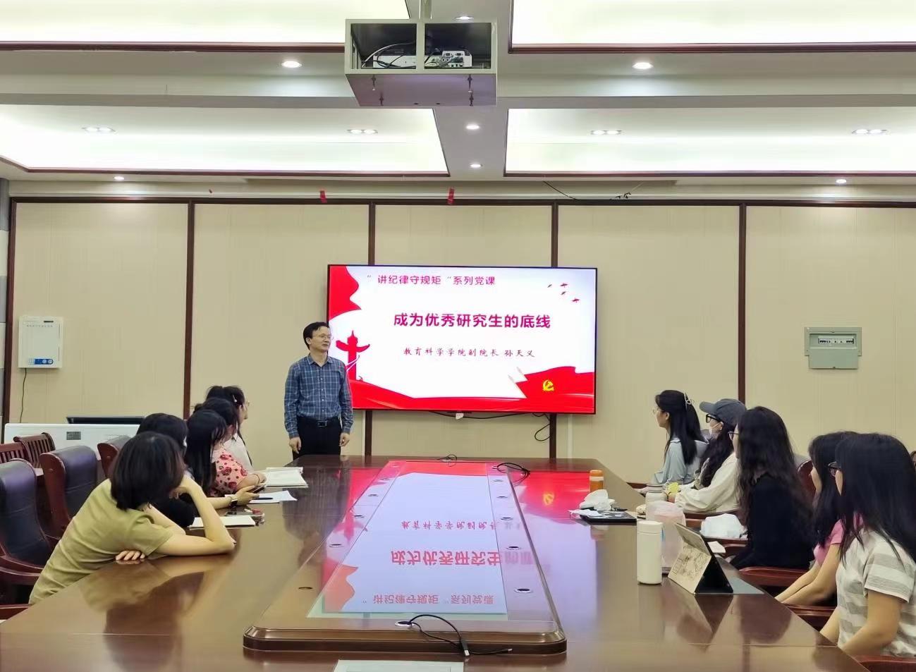 教育科学学院副院长孙天义以《成为优秀研究生的底线》为题,结合负面清单和典型案例,强调研究生党员要增强党性修养、保持优良党风、严守党的纪律、推进自我革命,处理好公与私、义与利、纪与情、道与术的关系,明大德、守公德、严私德、传美德,模范遵守法律法规、校规校纪、科研伦理和学术道德。