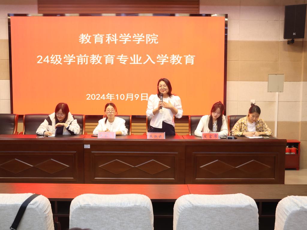 时间:2024-10-10 11:26:07 来源:教科院新闻宣传中心 作者:祐亚菊 聂文双 阅读: 次为解答2024级学前教育专业新生对于学前教育专业方面的疑问,10月9日,教育科学学院于教科楼301会议室开展24级学前教育专业入学教育。学前教育系主任朱春蕊、专业课老师朱欲晓、专职辅导员杨艺卓、21级学前教育专业和23级学前教育专业学生代表以及24级学前教育专业全体学生参加会议。