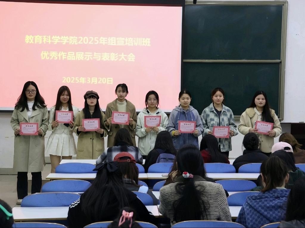时间:2025-03-21 11:52:05 来源:教科院新闻宣传中心 作者:吴皓 杨泽钰 阅读: 次为总结培训班的学习成果,激励更多个人与集体在新闻宣传工作中积极进取、勇于创新。3月20日晚,教育科学学院于教科楼108教室召开学生骨干新闻宣传能力培训班结业仪式暨表彰大会。院团委书记杨艺卓、各班级组宣委员、学生会及社团骨干参与仪式,此次结业仪式由谢陈铃主持。