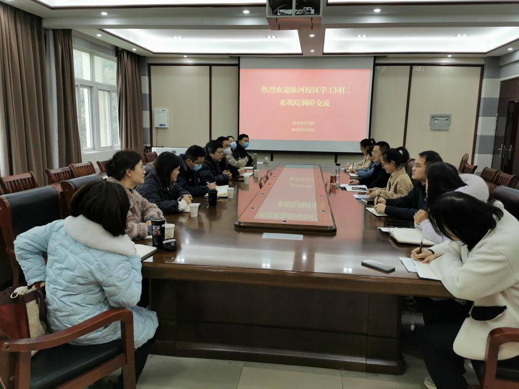 时间:2022-12-08 17:09:40 来源: 作者: 阅读: 次2022年12月8日上午,淮河校区学工队伍黄术余副书记一行七人在学生处副处长杨乐的带领下到教育科学学院调研,双方在教科楼402会议室进行了交流。出席交流会的有信阳师范学院学生处副处长杨乐,淮河校区工作委员会副书记黄术余,教育科学学院党委副书记董银银,淮河校区及教育科学学院专职辅导员。会议由教科院党委副书记董银银主持。