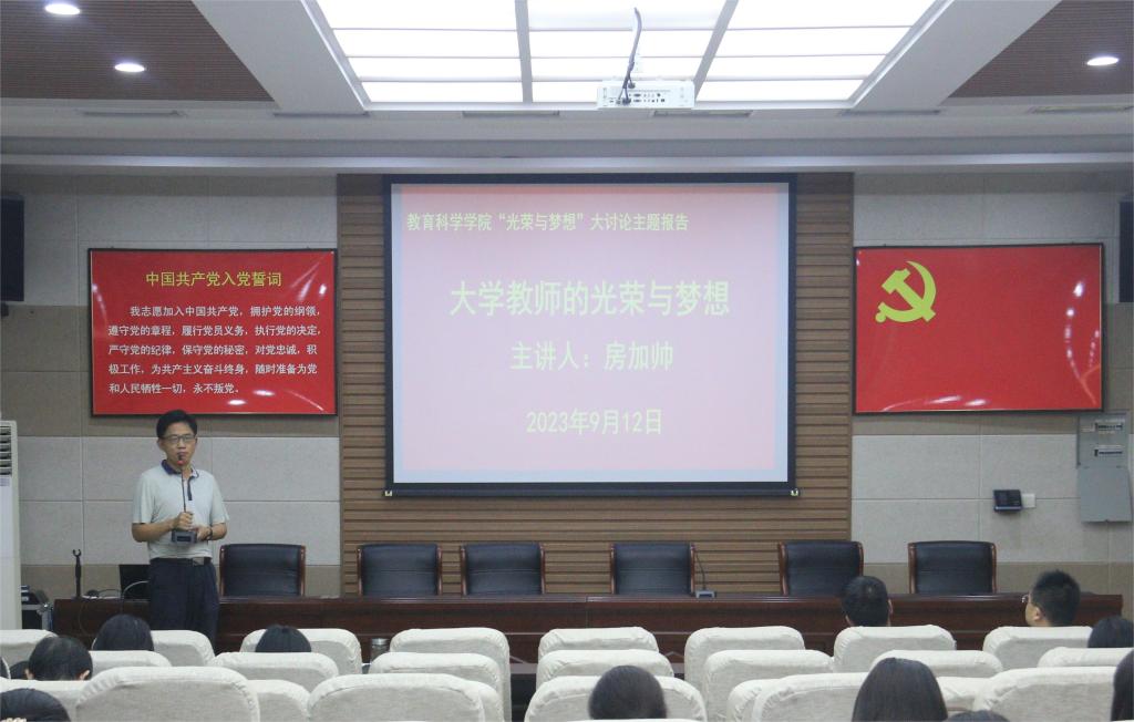 开展专题党课。9月12日,教育科学学院党委书记房加帅以《大学教师的光荣与梦想》为题给学院全体教职工作专题辅导报告。报告会上,房加帅结合学院教师业务发展实际,从“光荣源自梦想”、“光荣需要梦想”、“光荣催生新的梦想”、“架起光荣与梦想的桥梁”四个方面分析了更名前后老师的工作使命与责任担当,激励老师们把个人追求融入学校发展的洪流中,勇于追梦,实现更大的发展。