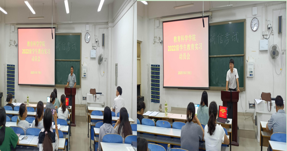 时间:2025-06-20 10:02:51 来源: 作者: 阅读: 次为扎实做好2022级学生教育实习工作,确保实习环节顺利推进。2025年6月19日,教育科学学院在教科203隆重召开2022级教育实习动员大会。教学副院长郭勇教授、党总支副书记缑星出席动员会并作动员讲话。2022级全体学生、相关班主任老师齐聚一堂。本次动员会由黄老师主持。