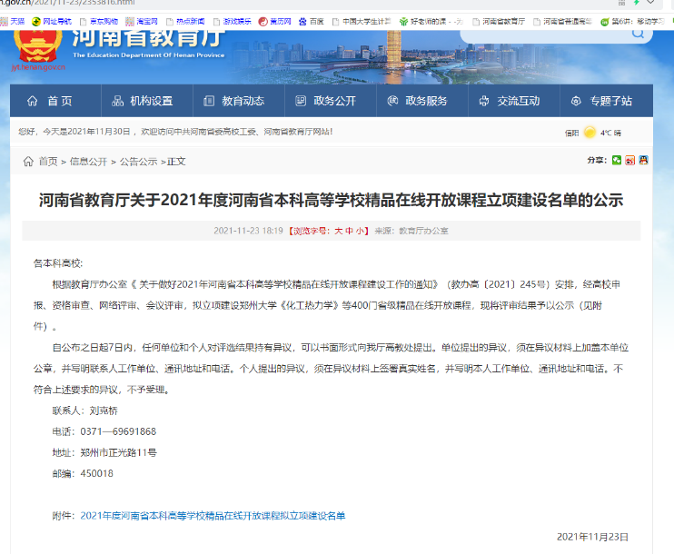 时间:2021-11-24 09:53:35 来源: 作者:黄伟玲 阅读: 次11月23日,河南省教育厅公布了2021年度河南省高校精品在线开放课程拟立项建设名单,我院刘萱老师负责的《现代教育技术应用》课程成功获批。